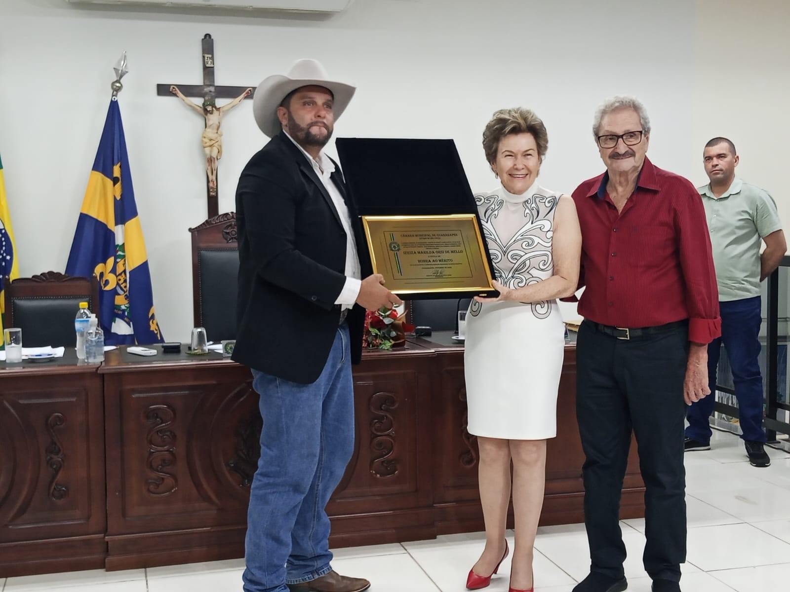 A honraria foi entregue na noite desta terça-feira (24/03), em cerimônia realizada pela Câmara Municipal, marcada por forte emoção entre familiares e amigos presentes. Dona Izeiza discursou e agradeceu a todos os presentes, emocionada, permanecendo ao lado de seu companheiro de vida, Nilton Publio de Mello, durante toda a homenagem.